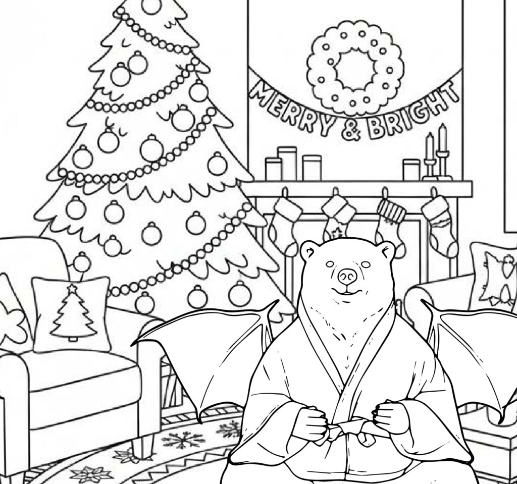 Heute wird’s bunt im Weihnachtswohnzimmer: Unser Super Chill Nice Bear wartet darauf, in deinen Lieblingsfarben zu strahlen! Lade die Malvorlage herunter und lege deine Stifte bereit – du kannst sie gestalten wie du willst, weihnachtlich in Rot und Grün oder kunterbunt wie ein Regenbogen.