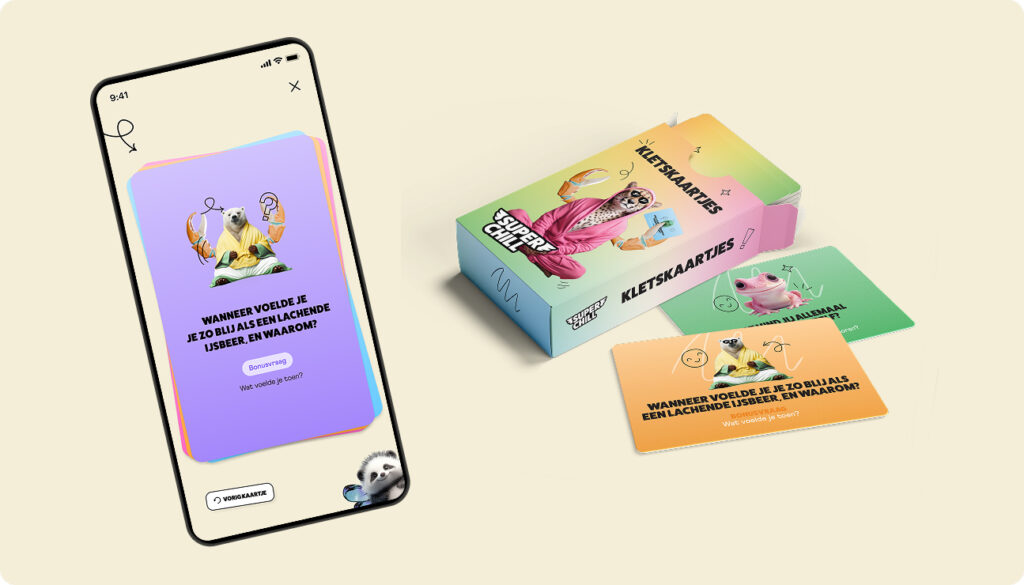De Kletskaartjes zijn voor iedereen digitaal beschikbaar in de de laatste versie van de Super Chill app (even updaten!). Open de app, druk op de knop en trek een willekeurig kaartje. Klets over wat er in het koppie omgaat – altijd en overal!